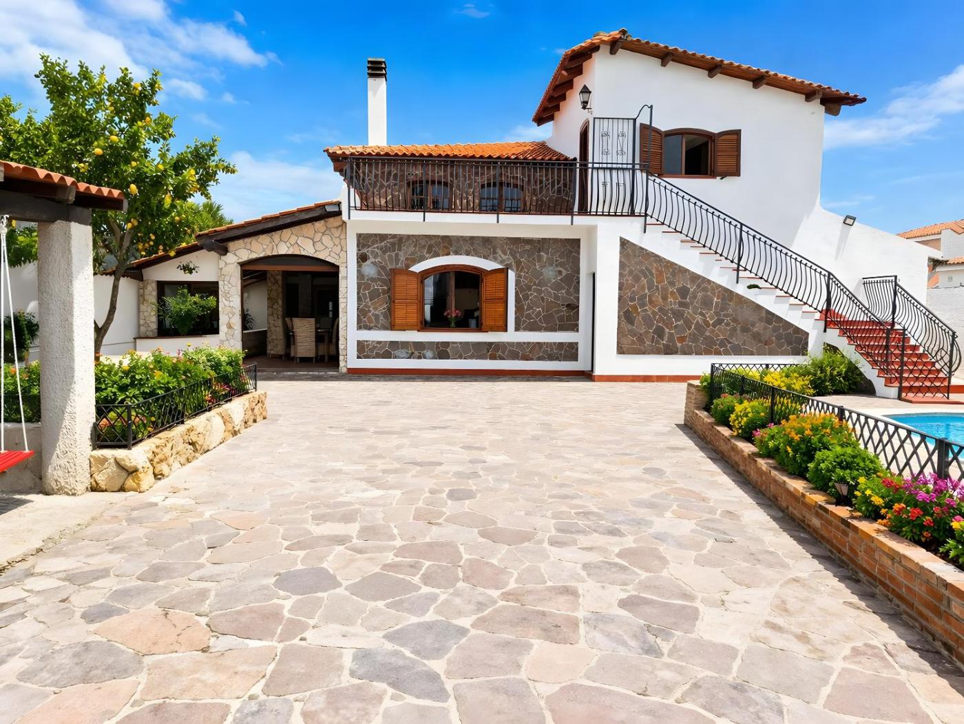 Questa villa ha 3 camere da letto, 2 bagni, lenzuola, asciugamani, una TV, una cucina con utensili e una terrazza con la vista sul giardino.